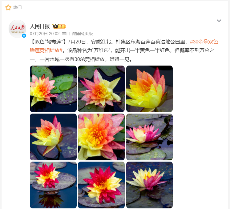 近日,百蓮百荷景區(qū)的睡蓮池水域里,30余朵雙色睡蓮競相綻放,吸引了眾多游客的眼球。百蓮百荷景區(qū)引進世界睡蓮冠軍的“萬維莎”品種,目前擴繁殖近萬株。因其花色鮮艷且多變,無規(guī)律可循,擁有“百變女王”的稱號,甚至能開出一半黃色一半紅色的雙色“鴛鴦蓮”,一片水域一次有30朵競相綻放,更加難得一見。引來大量游客及攝影愛好者打卡拍照,人民日報、騰訊網(wǎng)、搜狐網(wǎng)等多家主流媒體網(wǎng)站相繼轉(zhuǎn)發(fā)報道。