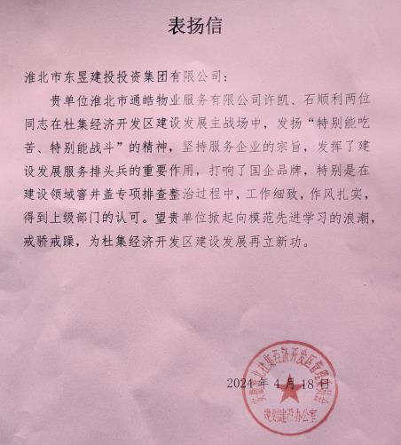26 04月2024 了解詳情 通皓物業(yè)喜獲杜集區(qū)經(jīng)濟(jì)開發(fā)區(qū)委員會(huì)表?yè)P(yáng)信一封 近日,通皓物業(yè)收到一封來自業(yè)主單位杜集區(qū)經(jīng)濟(jì)開發(fā)區(qū)委員會(huì)的表?yè)P(yáng)信,信中業(yè)主單位對(duì)我公司良好的工作作風(fēng)、熱枕的服務(wù)意識(shí)表示高度贊揚(yáng)。